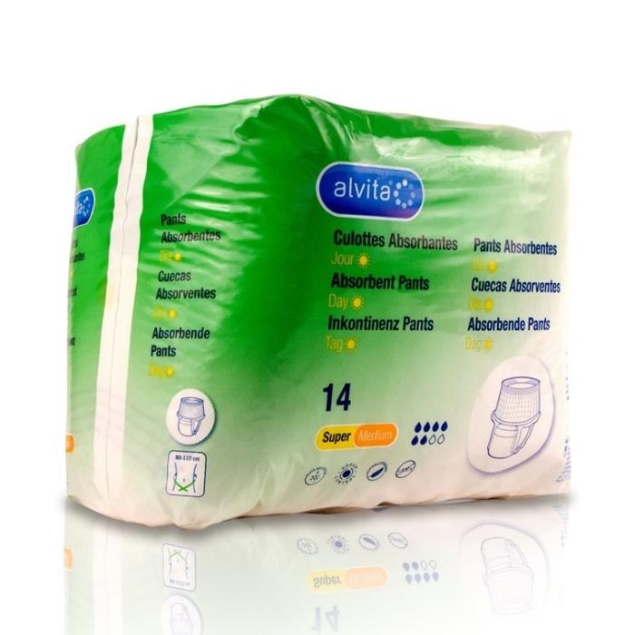 Alvita Cueca Incontinência Super Large 14 unidades, com as melhores cacterísticas, elevada capacidade de absorção, respiráveis, hipoalergénicos, neutralizadores de odor, sem látex e discretos.