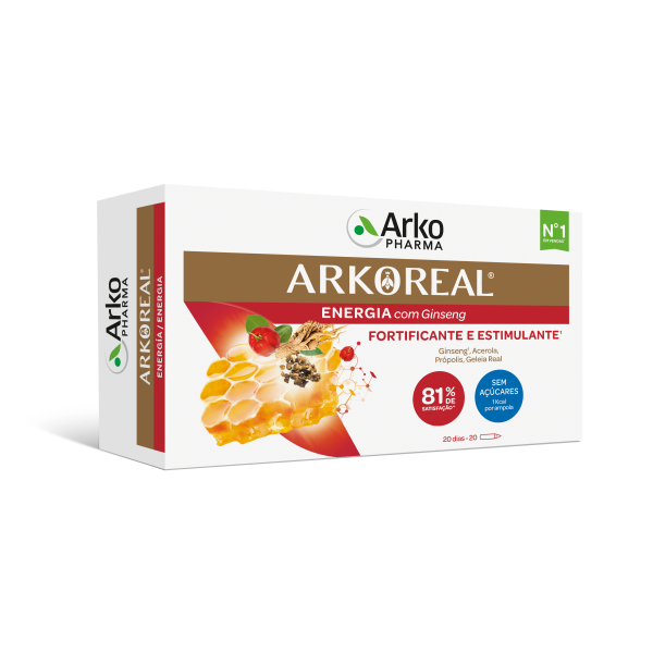 ARKOREAL® Geleia Real + Ginseng é um suplemento alimentar à base de Geleia Real, Ginseng, Própolis e Acerola.Ginseng ajuda no cansaço e na fadiga e contribui para a resistência física. A Geleia real é uma substância excretada pelas abelhas obreiras e é o alimento exclusivo da abelha rainha durante toda a sua existência. A esperança média de vida de uma abelha obreira é de 30 a 45 dias, enquanto que a rainha de uma colmeia pode viver até 5 anos. O Própolis, substância resinosa obtida pelas abelhas, é conhecido como um escudo natural da colmeia. A Acerola é um arbusto que produz um fruto comestível chamado "cereja das Antilhas".