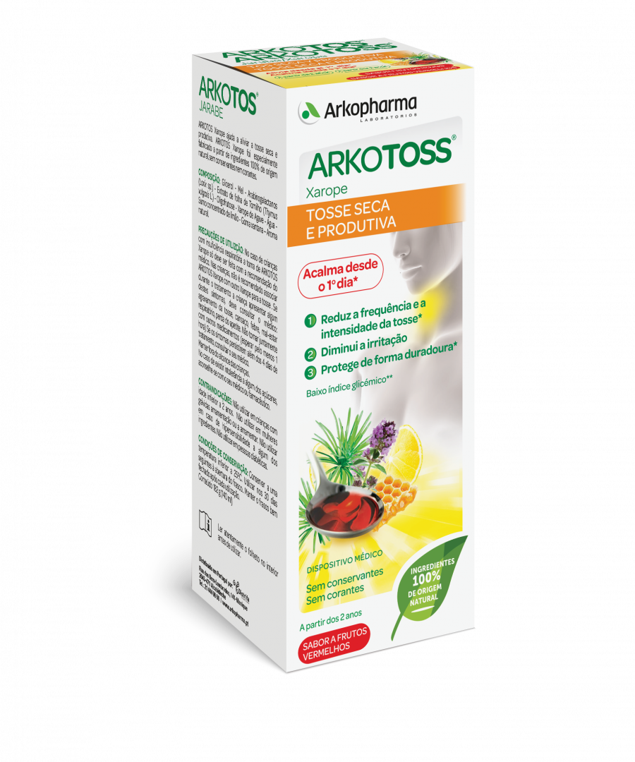 ARKOTOSS® Xarope é um Dispositivo médico Classe I. Leia cuidadosamente a rotulagem, as precauções e as instruções de utilização. Como medida de precaução, Arkotoss® Xarope está desaconselhado no primeiro trimestre de gravidez. Não utilizar em crianças com idade inferior a 2 anos, em caso de hipersensibilidade a algum dos constituintes e em caso de intolerância à frutose. Se os sintomas persistirem além dos 4 dias de tratamento, consultar o médico. *Cada dose de 5ml contém aproximadamente 1,5g de açúcares. Data de revisão do folheto: 2018-06. Em caso de dúvida consulte o seu médico ou farmacêutico