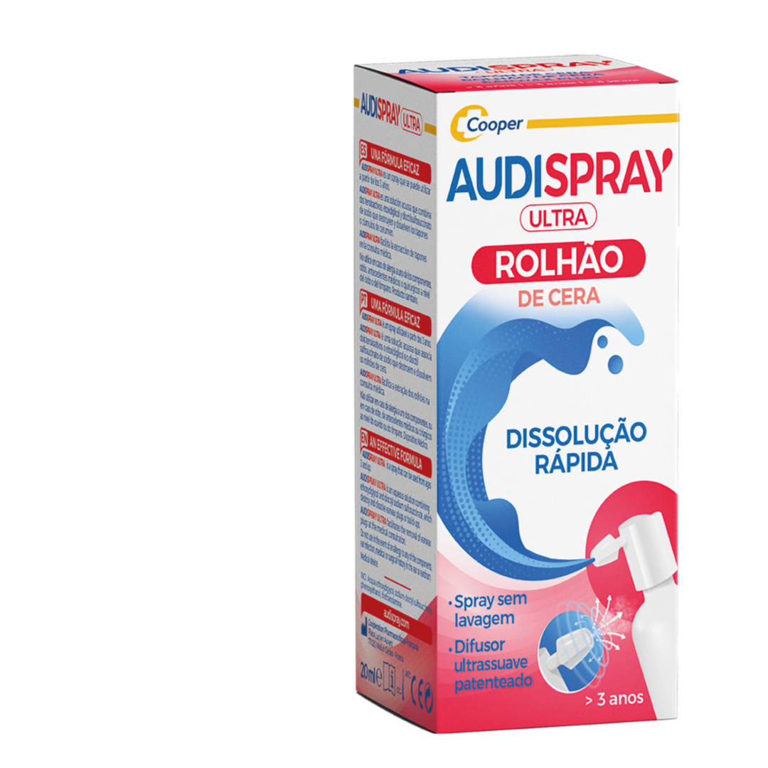 Audispray Ultra é um produto inovador para tratar rolhões auditivos já formados ou em desenvolvimento, em casa e com cuidado. A solução de tratamento Audispray Ultra dissocia o rolhão de cera numa fase inicial e dissolve os seus fragmentos numa segunda fase. Dispositivo Médico