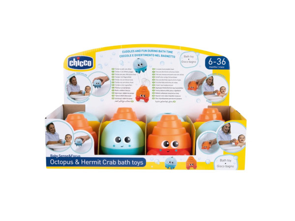 Divirta-se na hora do banho com o caranguejo eremita que cria uma espuma de bolhas e com o polvo com seu surpreendente efeito de chuva!