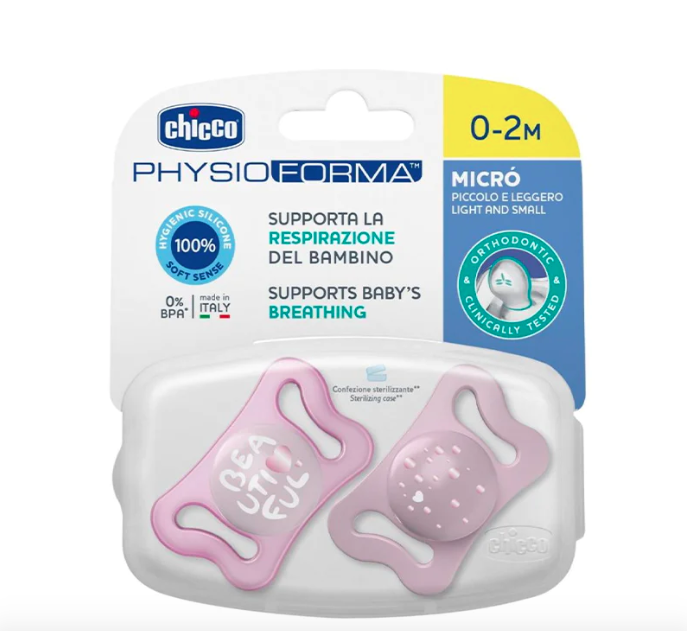 Chicco Physio Micro 0-2m Chupeta Rosa é um conjunto de 2 chupetas pequenas e leves, em silicone macio que suportam a respiração do bebé. Ideais desde o nascimento.