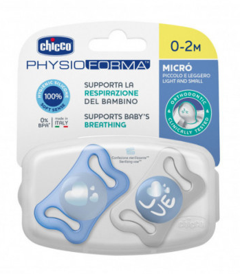 Chicco Physio Micro 0-2m Chupeta Azul é um conjunto de 2 chupetas pequenas e leves, em silicone macio que suportam a respiração do bebé. Ideais desde o nascimento.