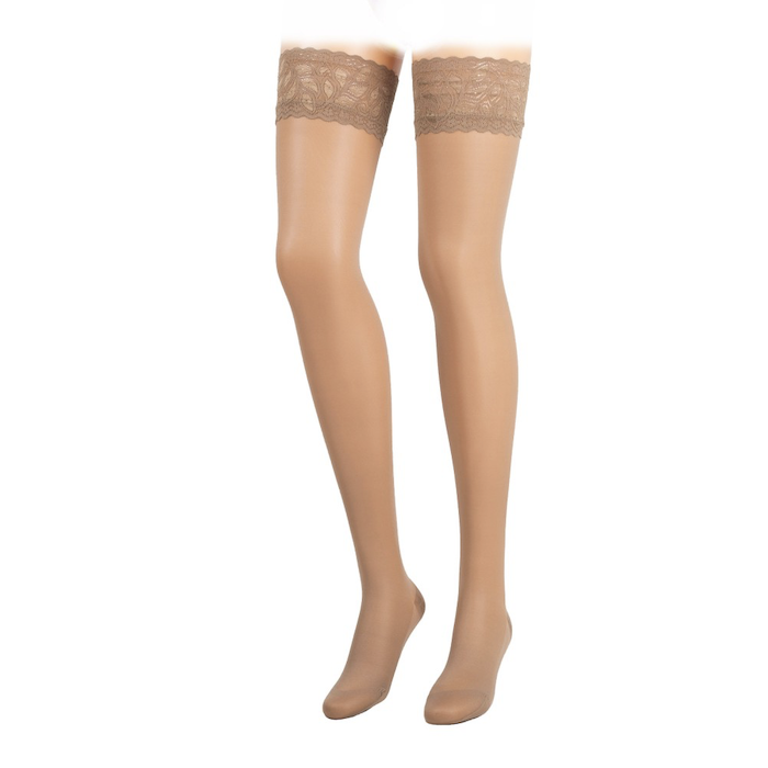 Meias de descanso com biqueira até á raíz da coxa com malha fina e elegante quase opaca.