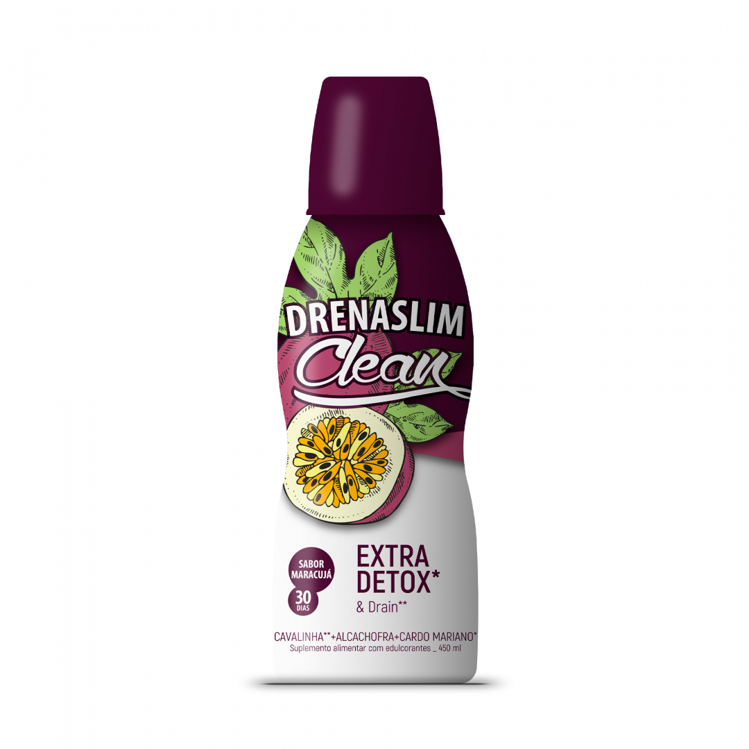 DrenaSlim Clean 450ml contém cavalinha para ajudar a eliminar a água do organismoAlcachofra e Cardo Mariano para facilitar a digestão, promover o normal funcionamento do fígado e ajudar à desintoxicação hepática.