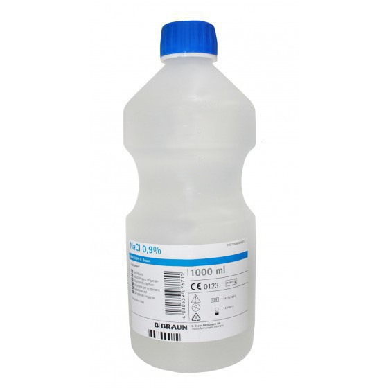 Soro fisiológico estéril para irrigação em embalagem com rosca ecotainer.