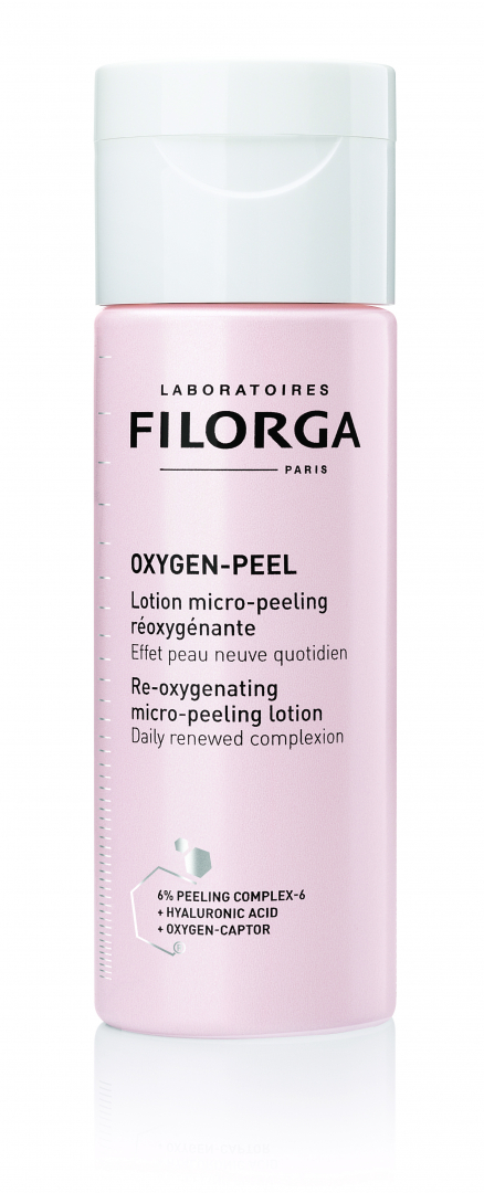 Loção micropeeling reoxigenante. Loção micropeeling reoxigenante para textura irregular, poros dilatados, rídulas e falta de luminosidade. Com a ajuda de um disco de algodão, aplicar no rosto perfeitamente limpo apenas à noite.