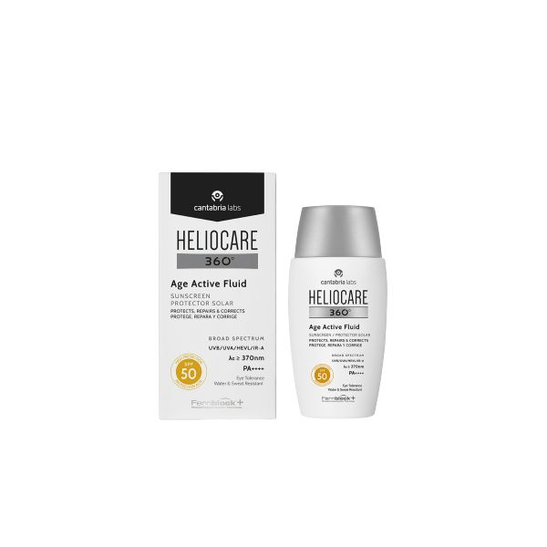Heliocare 360º Age Active Fluid SPF50 ajuda a reparar e proteger a pele do rosto durante a exposição solar.