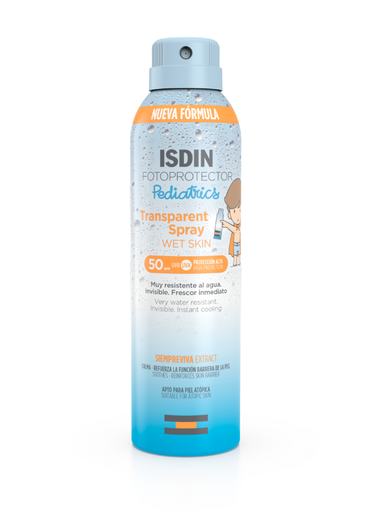 Fotoprotetor corporal em spray transparente, fresco e de absorção imediata, especialmente formulado para a pele das crianças. A partir dos 3 anos. Fotoproteção invisível e ligeira, eficaz em pele molhada