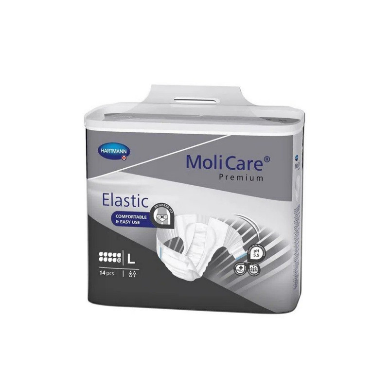 Molicare Premium Elastic Fralda 10 Gotas L x14 são adequadas para pessoas ativas e doentes acamados, fornecendo proteção, segurança e conforto. O número de gotas apresentado na embalagem indica a resistência à incontinência urinária e/ou fecal.