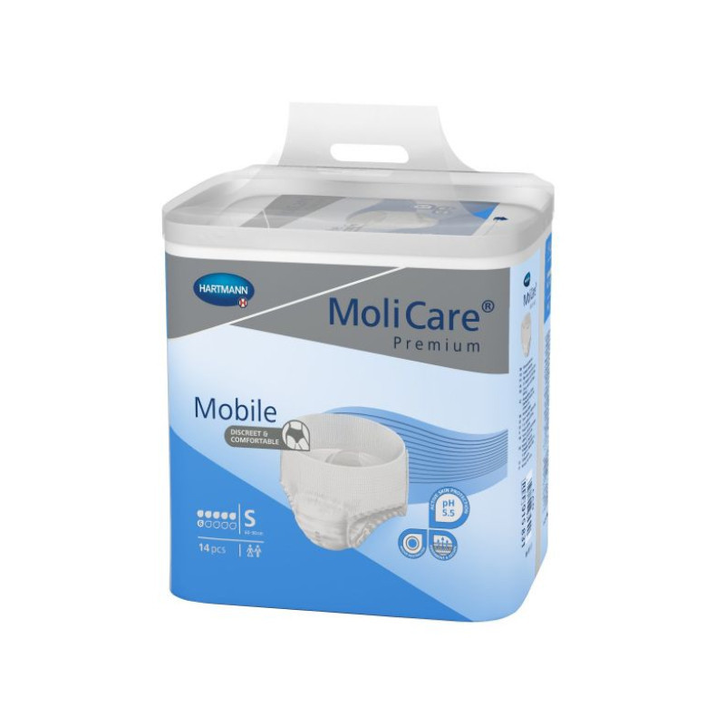 Molicare Premium Mobile 6 Gotas Cueca S x14 estão indicadas em casos de incontinência urinária média. Cuecas unisexo descartáveis com núcleo absorvente e barreiras antifugas.
