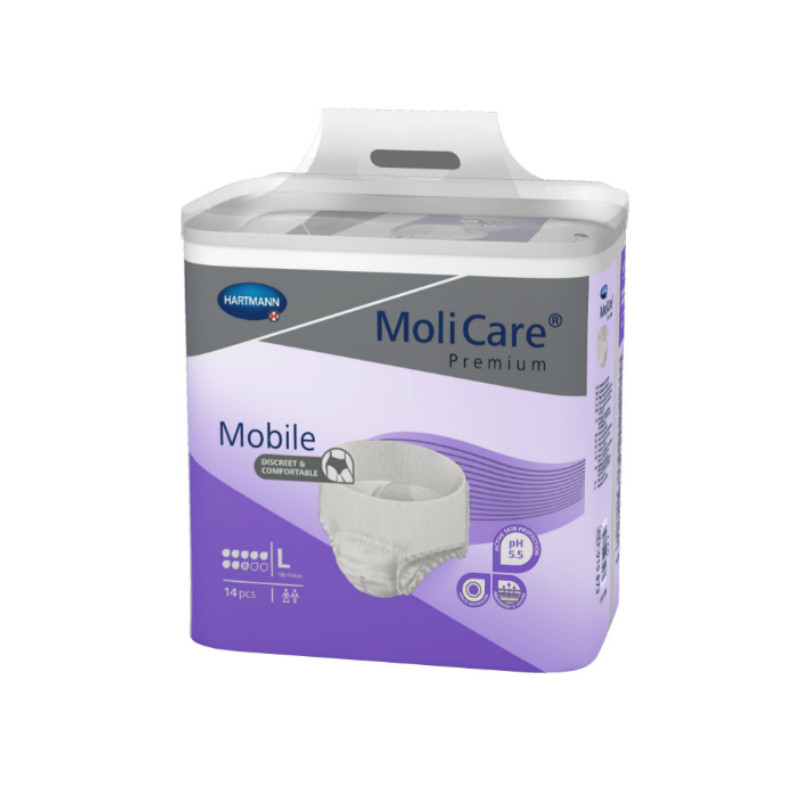 Molicare Premium Mobile 8 Gotas Cueca L x14 estão indicadas em casos de incontinência urinária grave. Cuecas unisexo descartáveis com núcleo absorvente e barreiras antifugas.