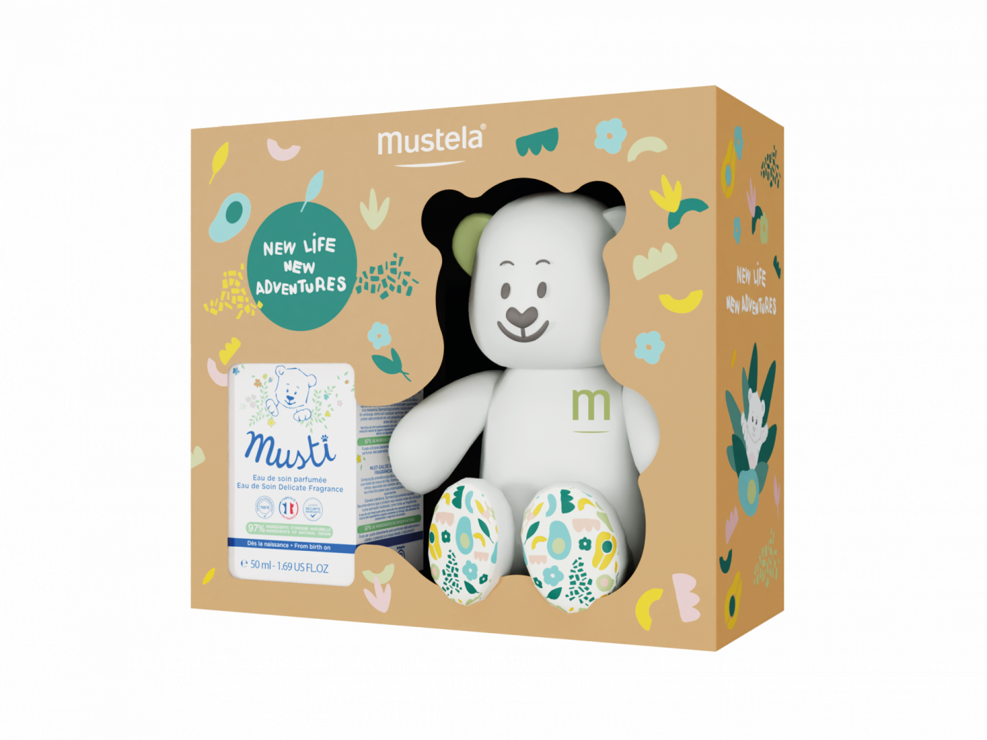 Coffret Musti Natal Pastel. O ursinho Musti Pastel, a acompanhar o dia a dia dos bebés e crianças, com o encanto do perfume Mustela.