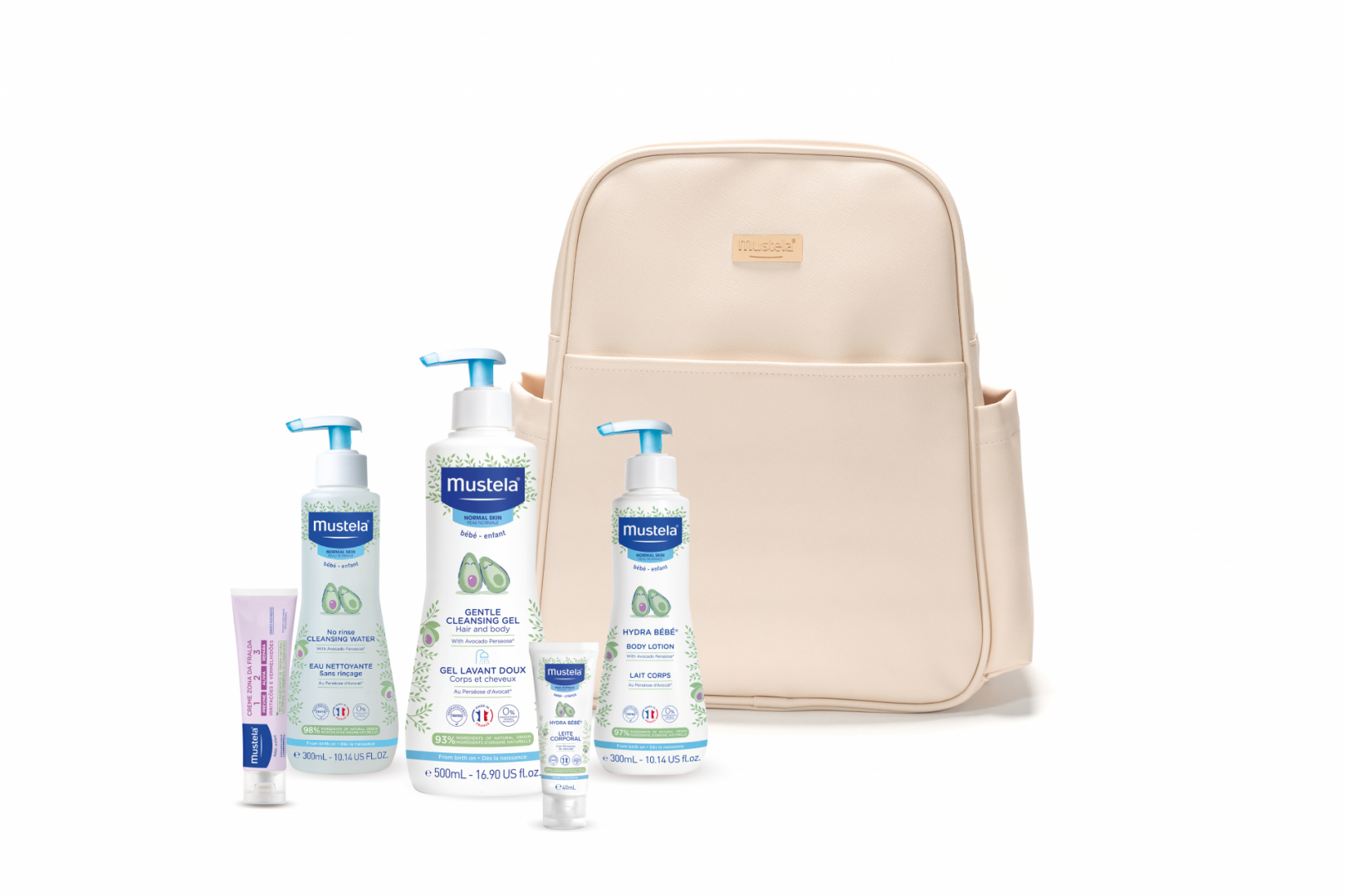 Cada Mala de Maternidade inclui uma seleção dos produtos indispensáveis Mustela, formulados com ativos naturais para cuidar da pele delicada do bebé desde o nascimento: