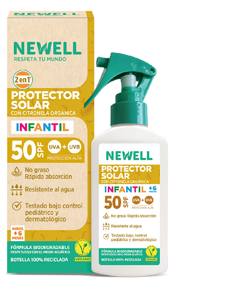 O Spray Solar SPF 50 Infantil Newell com citronela orgânica é um protetor solar formulado com citronela orgânica, conhecida pelas suas propriedades repelentes de insetos, oferecendo até 3 horas de proteção contra o mosquito tigre. A sua textura leve é rapidamente absorvida, deixando a pele hidratada e sem efeito esbranquiçado. Aplicação fácil em spray para adultos e crianças. Fórmula vegana.