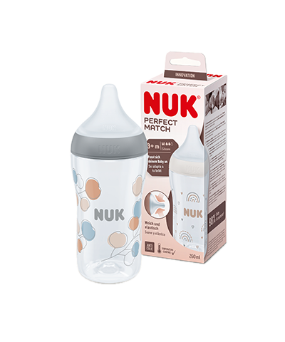 Adapta-se individualmente ao teu bebé - tetina particularmente suave e flexível. Formato perfeito para a boca do bebé, com válvula anticólica, para um fluxo ao beber calmo e relaxado, tamanho M para conteúdo de 260 ml (a partir dos 3 meses) e tamanho S para conteúdo de 150 ml (desde 0 meses).Apoio labial grande e macio para os lábios, garante que o bebé tenha sempre uma sensação semelhante à pele enquanto mama.Graças ao indicador de controlo de temperatura patenteado, a escala no biberão muda de azul para branco se o conteúdo estiver demasiado quente. Sem BPA.Compatível com todos os acessórios das bombas tira-leite NUK Perfect Match e NUK Soft&Easy.