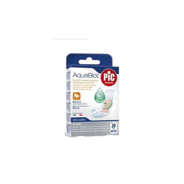 Pic Solution Aquabloc Pensos Rápidos não se sentem e não se vêem: a película especial em poliuretano torna os pensos finos e invisíveis. Possuem uma barreira impermeável contra água.Podem ser mantidos aplicados na pele durante vários dias. Podem ser utilizados em todas as situações em que a pele pode aquecer ou suar como por exemplo na piscina, no mar, ou quando se tomam duches ou banhos quentes, etc.Adaptáveis também nas áreas mais difíceis do corpo. Têm clorohexidina que atua como antibacteriano e previne a contaminação da ferida.Material: poliuretano.Tamanho: 4 pensos 25 x 72 mm, 8 pensos 19 x 72 mm, 4 pensos 57 x 16 mm e 4 pensos redondos (22,5 mm).