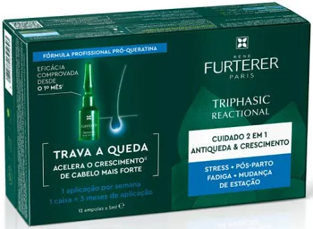 A queda de cabelo reacional é provocada por diversos fatores externos: stress, fadiga, regimes alimentares, pós-parto ou tratamentos medicamentosos. Triphasic Reacional é o cuidado completo para travar a queda reacional dos cabelos e relançar rapidamente o seu crescimento. Um complexo único de ingredientes ativos de elevada eficácia, que conjuga 3 ações fundamentais para aumentar visivelmente a massa capilar e devolver o vigor e a vitalidade: 1 - TRAVAR A QUEDA: (inovação Antiqueda) Lotus Mineral ComplexTM. Associação de ingredientes ativos, minimiza os efeitos do stress sobre a pele*** de forma a preservar o equilíbrio do couro cabeludo. Graças a estas ações conjugadas com o extrato de origem natural de Pfáffia***, óleos essenciais, arginina e a massagem, a microcirculação cutânea é favorecida e o aporte em elementos nutritivos e energéticos é aumentado. 2 - FACILITA O CRESCIMENTO: O ATP, fonte de energia essencial para o crescimento do cabelo, atua como um verdadeiro sinal energético precoce para rapidamente facilitar o crescimento do cabelo***. 3 - REFORÇAR OS CABELOS: Uma vez restabelecido o crescimento, a associação de Biotina e de oligoelementos, fortifica e nutre o bolbo piloso para cabelos mais resistente e mais fortes. RESULTADOS: Desde o 1º mês, a queda é visivelmente travada, o crescimento é favorecido. O cabelo fica mais farto, rapidamente recupera força e densidade. CONSELHOS DE UTILIZAÇÃO: THRIPHASIC REACIONAL utiliza-se 1 vez por semana durante 3 meses. Após a lavagem, aplicar a totalidade de uma ampola risca a risca, sobre o couro cabeludo limpo e húmido. Massajar o couro cabeludo para favorecer a absorção do produto. Não enxaguar. *IQVIA (IMS & Quintilles) - Pharmatrend - mercado dos cuidados Antiqueda (excetos medicamentos) em farmácia em França - Ano 2017 - em volume e valor. **Estudo realizado em 40 indivíduos durante 28 dias. ***Ingrediente ativo testado in vitro. Uma só aplicação por semana - cuidado completo para 3 meses Adaptado aos couros cabeludos sensíveis. Sem enxaguar - Não cola