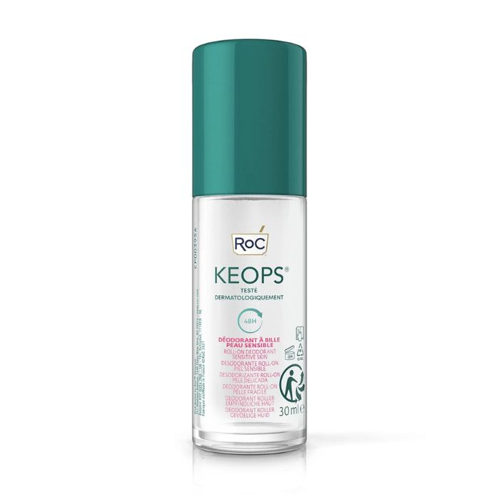 Roc Keops Deo Roll-On Sensitive 30ml, oferece eficácia até 48 horas para peles frágeis e sensíveis.