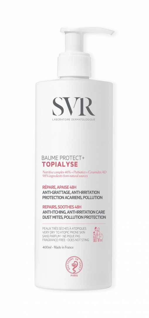 TOPIALYSE BAUME PROTECT+ é o primeiro produto de cuidado da pele enriquecido com a nossa patente de Ceramidas AD1 que protege contra agressores ambientais (ácaros, poluição, etc.) que podem agravar a irritação e a comichão. Este bálsamo alivia imediata e duradouramente as sensações de prurido, resultando numa pele que se mantém suave, protegida e reparada. A sua textura nutritiva e lipídica funde-se na pele, deixando uma película protetora que impede a adesão de partículas de poluição. Graças à sua fórmula não oleosa e não pegajosa, pode vestir-se logo a seguir à sua aplicação! TOPIALYSE BAUME PROTECT+ é feito a partir de apenas 20 ingredientes que são 98% de origem natural. Sem fragrâncias, mas com um aroma delicado.