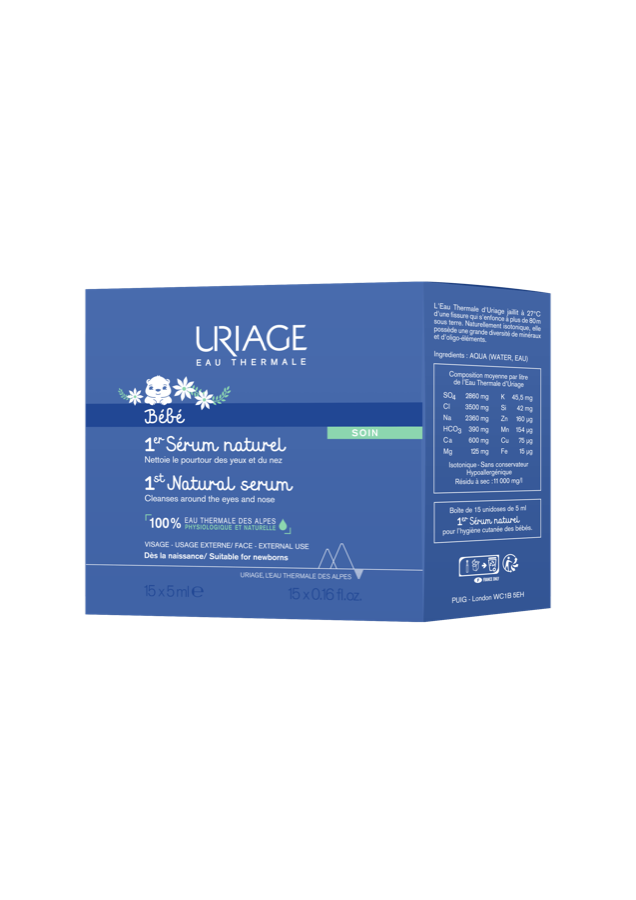 Água Termal de Uriage dos Alpes Franceses, fisiológica e 100% natural. Higiene suave do contorno dos olhos e nariz dos bebés e crianças. Com uma concentração excecional de minerais e oligoelementos, tem propriedades calmantes e suavizantes.