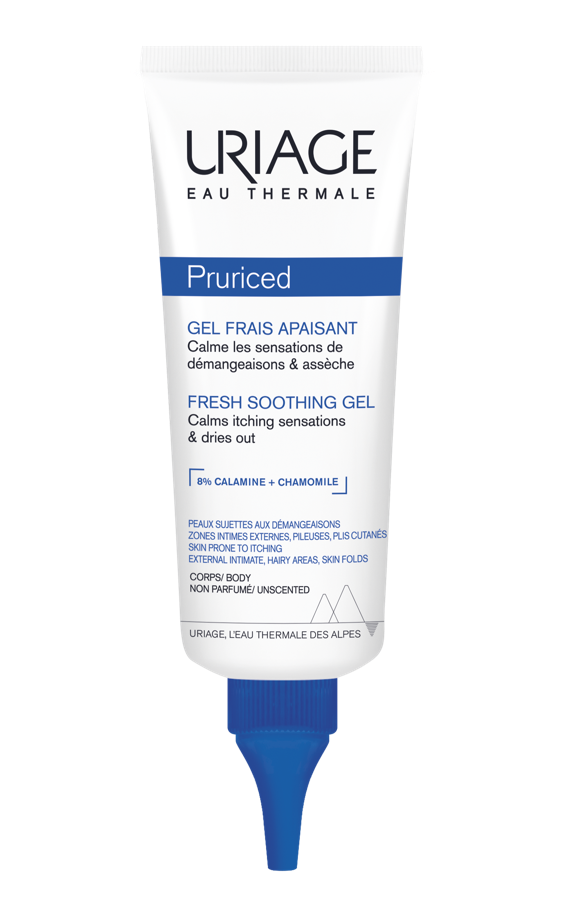 INOVAÇÃO PRURICED ANTI-PRURIDO Este gel fresco acalma a comichão, o formigueiro e o desconforto cutâneo das zonas com pêlos em risco de maceração (pregas cutâneas, zona anogenital); é indicado para todos os tipos de pele. Princípios ativos dermatológicos: . AÇÃO ANTI-PRURIDO A sua elevada concentração de princípios ativos dermatológicos calmantes reduz as sensações de prurido, acalma e seca a pele. INOVAÇÃO PATENTEADA Ação patenteada exclusiva Uriage sobre os receptores PAR-2 responsáveis pela sensação de prurido. ELEVADA TOLERÂNCIA A Água Termal Uriage suaviza e acalma todos os tipos de pele, mesmo as sensíveis. Testada dermatologicamente. Indicada para recém-nascidos, crianças, adultos e idosos.