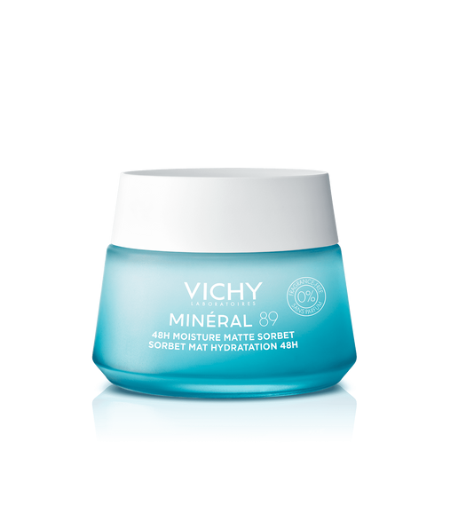 Minéral 89 Gel Sorbet Matte Hidratação 48h proporciona uma hidratação duradoura, e uma sensação de frescura e leveza na pele.Concebido especificamente para pele mista e oleosa.Não é comedogénico.