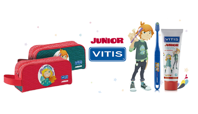 Vitis Junior estojo de higiene oral contém um gel dentífrico Vitis Junio de 75ml e uma escova de dentes Junior.